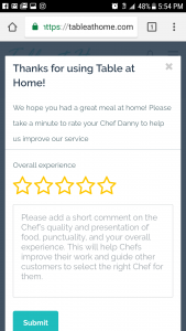If for some reason, you are having problem providing a review of your chef, please don’t hesitate to contact us at support@tableathome.com